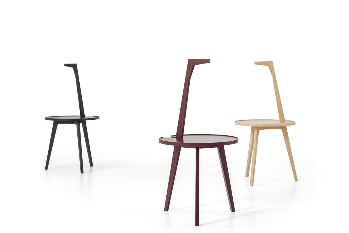 Tavolino con struttura e piano in noce canaletto oppure in frassino naturale, tinto nero o tinto amaranto. Un animale domestico. Un servomuto con una gamba che si allunga e diventa collo-becco/manico. Il piano è bordato come un vassoio. Leggero, ludico.