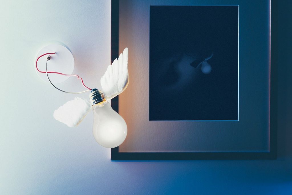 Lucellino è in vetro, ottone, materiale sintetico, ali in piume d’oca lavorate a mano.
